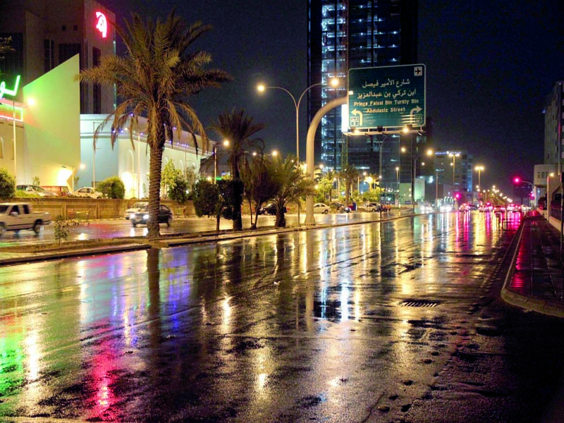 شارع التحلية في الرياض كما بدا مساء أمس بعد أن غسله المطر