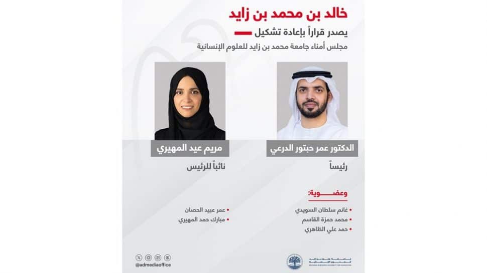 أصدر سموّ الشيخ خالد بن محمد بن زايد آل نهيان، ولي عهد أبوظبي رئيس المجلس التنفيذي لإمارة أبوظبي، قراراً بإعادة تشكيل مجلس أمناء جامعة محمد بن زايد للعلوم الإنسانية برئاسة معالي الدكتور عمر حبتور الدرعي، ومعالي مريم عيد المهيري نائباً للرئيس.
