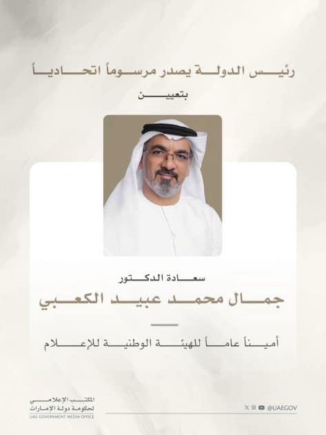 وام / أصدر صاحب السمو الشيخ محمد بن زايد آل نهيان، رئيس الدولة، “حفظه الله”، مرسوماً اتحادياً بتعيين سعادة الدكتور جمال محمد عبيد الكعبي أميناً عاماً للهيئة الوطنية للإعلام، بدرجة وكيل وزارة.
