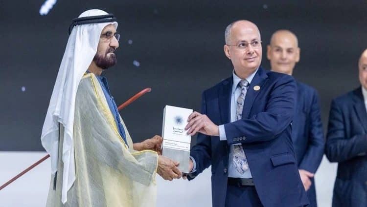 ويوسف مانع العتيبة سفير الدولة لدى الولايات المتحدة الأمريكية ومحمد مبارك المزروعي وكيل ديوان ولي عهد أبوظبي.
